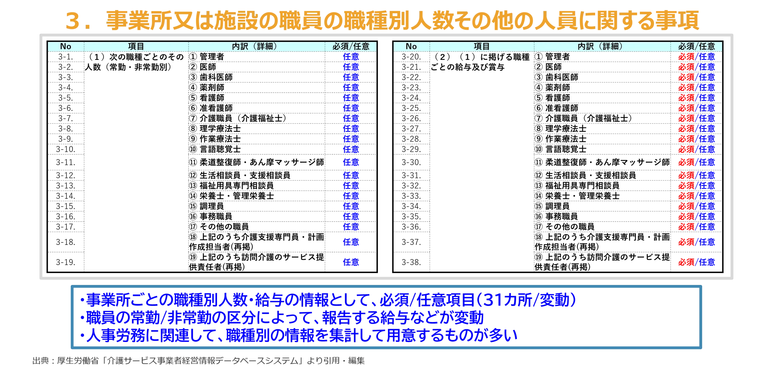 ・事業所ごとの職種別人数・給与の情報として、必須/任意項目(31カ所/変動)